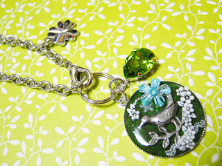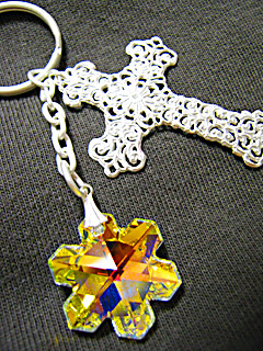 白で統一したキーホルダー。 雪の結晶のクリスタライズが黄色に見えますが 実際は透明キラキラです。 結構大きめなので、カバンにつけるとヨイかも♪ 最近思うんだけど、レジンで封入したアクセサリーパーツは ペンダントよりもバッグチャーム・ピンブローチ系の方が使いやすい気がしてなりません。 身体につける物はそんなに自己主張していない小さめの物、 持ち物につける物は多少の派手や大きめでもOK! そんなイメージが出来上がってます。 そんなこと決まっていることではないとは思っているんだけど、 たぶん自分の好みがそうなんでしょう(^^ゞ でもそれはそれで自分が納得できる物が出来るのであれば そのスタンスでやればいいのかなと思ってます。 ↑↑こんなことを考えつつも、まだまだ色々やってみたいことが沢山あって(^^ゞ 本当に困ります。やらなくてはいけないことも沢山あるクセにね〜。 とりあえず、やってみたいことを箇条書き。 ビーズ(でも大変そうだよ_| ̄|○) トンボ玉作成。 チャーム(ピューターでもブレスでも)を作ってみたい。今度はやってみたいではなくて「(また)やりたいこと」。 キューピーキャラの作成(おいおいまたか(笑) ウナギの山椒煮を作りたい。 イワシの生姜煮も作りたい。 沢山ある日本手拭いで何か作りたい。 あと色々なんかこう色々やってみたいお年頃(笑) (私信) >●宵さん ウチのPC、safariもダメなんですね(^^ゞ何しろOSが9なので。もう古代のOSです(笑)なんとかネスケでやっとこさってカンジです(^^ゞ(^^ゞ(←前言撤回!ネスケでやると、改行設定がききませんでした…_| ̄|○)ブルーベリージャムは美味しくできたのに、家族誰も試食以降手を付けないんですよ(--#)なのでヨーグルトに入れて全部食べました(笑)まあ量も少なかったんですけどね〜。 >●Aさん ドモ!生き別れのsisterです(笑)病院の薬、お金かかりますよね〜(泪)でも近い将来はそうなるんだとは思いますが、なるべく遠くにしたいとは思ってます(^^ゞこの関係以外はすべて正常値なんですよ。どうしてもあの数値だけはダメなんですよね_| ̄|○ |