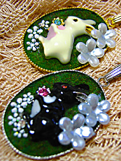 ウサギのペンダント。 白ウサギはゴールドのチェーン、 黒ウサギはシルバーのチェーンです。 バックは芝生っぽいカンジで、とても立体感のある仕上がりになってます。 ペンダントヘッドとしてはそんなに大きい方ではないのですが (かといって小さいわけでもないですが(^^ゞ) 立体っぽい分大きく感じるので、バッグチャームやピンブローチにしても イイカンジだと思います(^_^)ニコニコ 今日は皆既日食!! 会社からネットで見ようと思っているんだけど、 私のPCはMACのOSが9!! 古いので中継のカムが見られません(泪) ラジオで実況中継してるけどさ、 現地のスタッフだけ盛り上がっていて、ウチの会社内は 全く盛り上がってません(笑) 外は曇りだしね〜(−o−)y−゜゜゜゜゜ 仕方ない…家帰ってからニュース見よう…。 (7/21) >●美さん こーんにちわーん♪実家へ帰って風邪を貰ってくるなんて!!最悪です(^^ゞ(^^ゞでも自分の家へ戻ってきたら少し良くなってきたので、やはり原因は家族の風邪です(笑)今週も帰るので気を付けたいと…(^^ゞそちらは日食見えますか…?って今日は全国的に曇〜雨っぽいようですよね〜。そんなときに日食にならんでも(笑)そうそう!!ワンコ!!カワイイですねvvvvvvあのポーズもたまんないッ!! |