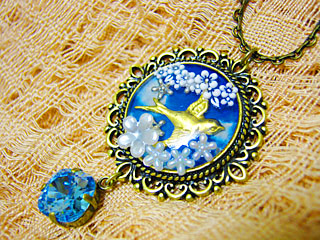 青い空と青いヴィンテージスワロ。 白い雲と白い花。 金古美のフレームと金色の鳥。 チェーンはレースデザインの金古美。 昨晩、レジンの封入作業をしました。 数も少なかったし、そんなに時間もかからなかっただろうと 思っていたけど、気が付くと0時まわってるし(^^ゞ(^^ゞ オバアなので、ある程度の睡眠時間をとらないと 会社で激ネムになってしまいます。_| ̄|○ガクリ いっつも思うことだけど、あれだけ気泡潰しに気を使っているのに、 昨晩無かったはずの気泡が朝になるとあって、 しかもそのまま固まってるし!!(泪) 一体何処からくるんだ?気泡!!(笑) ちなみに気泡の修正は、気泡に穴をあけてそこに レジンを流します。たったこれだけなんですが、 このごくごく少量のレジンを作るのが、勿体ない!! 使う量よりも混ぜるときに入れ物に付くほうが多いです(笑) 次回レジン封入用のセットを作らないと!! デフェスまで3ヶ月ジャン!! |