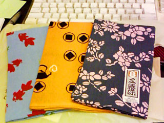 会社のそばの手ぬぐい屋さんで購入。 結構な枚数を持ってます…手ぬぐい。 地が白い物は、ふきんとかに使ったりしますが、 写真のように地にも色が入っている物は、 縫ったりしてエコバッグや巾着にします。 左から、 ◆金魚 ◆やかんとせんべい(笑) ◆花(菊と椿?) 家にある手ぬぐいを見たら、地が白い物ばかりだったので 今回はカラフルな柄ばかりを。 柄なんて気にしないのであれば、¥100ショップでも売ってますね。 ウチの会社のお客さんに、着物の絞りをやっている処があって そこから頂くお年賀が、毎年手ぬぐいなので、 社長に言って、貰ってます(^^ゞ そうそう、先日100均で「クルミボタン作成キット」なるものを 売っているのを発見しまして、 手ぬぐいの柄を使ってクルミボタンを作って ヘアピンとかヘアゴムとか作ったらカワイイ!!(・・)(。。)(・・)(。。)ウンウン と思い、物作りの虫がウズウズしだしたんですけど ちょっと、アチコチに手を出しスギかもと思い、ガマン(笑) それに手ぬぐいを切り刻むのって、ちょっと勿体ない感があったりして(^^ゞ どうしてもやってみたくなったらやってみます。 (時間の問題だったりして〜(^^ゞ) クルミボタンを作って、ヘアピンやヘアゴムとかを作ったら カワイイと思ってさ〜〜〜(-。-)y-゜゜ |