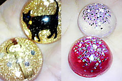 二度目のテスト。 まあまあイイカンジに出来たかと思います(^^ゞ 冬で寒いからナカナカ固まらないのですけど、まあそれは仕方ない。 固まった後に、削ったり磨いたりしてカタチを整えていくのですが、 さすがに手先の作業で、寒い中でやるのはやりにくい。 なのでとうとう古い電気ストーブを出しました☆ 今年も故障しないで春まで頑張っていただきたい!!是非!! で、こんなのも作ってみました。 わかりにくいと思いますが、半球のカタチをしてまして、 色つけたり、ラメ入れたりしてます。 サイズは1.5cmと3cmぐらい。 ストラップでもネックレスでもイケルかと…。 これ以外にも、ビー玉を入れたペーパーウエイトも作りました。 (一番上の写真の左上にちょこっと見えてます) でも樹脂は軽いので、あまりペーパーウェイトらしくないカモ。 しかしその中でも、オススメ作品がコレ!! さあ何が入ってるのでショウ? 答えは、お弁当に入っている魚のカタチの醤油入れ(笑) 中身は本当に醤油が入ってます。 (カラの醤油入れを100均で買い、醤油を入れた) これこそ試作なんですが、結構面白いかなって思ってます。 中身を醤油にしなくてもいいワケだし。( ̄ー ̄)ニヤリッ 透明樹脂自体が結構お高めなので 他のコストを抑えつつ、いかに面白い物・綺麗な物を作れるかが 今後の課題です。 ここに画像は載せてないけど、森●ラムネの中に顔が書いてあるものがあるので それを樹脂で固めてみたんだけど、顔部分の凹凸があまりないので ただラムネを固めました…みたいになってしまった_| ̄|○ガクリ まあ…よく見ると顔がわかるような…分からないような…(^^ゞ(^^ゞ(^^ゞ (私信) >●宵さん そうです〜。あれは製氷器です〜(笑)「スーパーレジンクリア2」売ってました!!結構値段に開きがありますよね。でもって、この商品は透明度が高いけど扱いにくい(少しでも硬化剤の量を間違えると固まらない)とか、失敗は少ないけど、透明度が月並みとか(^^ゞ色々あるみたいです。臭いに関しては、私が使っているのは、ほぼ無臭でした。これも商品によってなんだそうです。それからアンテナの話!マンションではなかったのですね…すみません(^^ゞN●Kの息がかかっているってことですかね〜? |