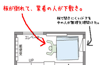ウチの会社のビルは10階建てで 表と裏に出入り口があるんです。 表はビルの持ち主の玄関で 地下から地上10階までを縦に半分使っています。 (10階は全部使ってるみたいです) 残りの縦半分が、裏からの出入り口を使って 一般の住居者や会社が入っております。 もちろんウチは裏から入っているのですが、 こんな感じの出入り口になってます。 建物までに階段があって、更に1階のエレベーターまでも 階段があるという、全くバリアフリーとは縁遠い建物(苦笑)。 そのビルの10階で内外装の工事が入ってまして、 昨日は内壁のパネル…か何かに使うような コンクリっぽいパネルを何枚も運んでいたんですね。 しかし、運ぶには私も使用しているエレベーターを 使わないと運べないので、 図のように、右の壁に纏めて立てかけていたそうです。 その時は、図の右にあるドアは閉まっておりました。 このドアは、表の会社の方々の出入り口のようなんですが、 普段はもちろん閉まった状態。 でも結構出たり入ったりしてます。 板を立てかけてエレベーターを待っているとき、 右側のドアを開ける人がいたんですね。 この板はかなり重くて、一般男性が一人で持つには、 かなりキビシイくらいの重さなんだそうです。 それが10枚程立てかけてあったのに ドアを開けきったヤツがいて、 なんと、板全てを倒してしまったんです。 そばにいた業者の方がその板の下敷きになってしまいました。 救急車で運ばれたのですが、両足骨折。 このエレベーター前の踊り場は狭いので、 よく階段下に板が滑り落ちなかったと思いました。 もしも階段の下にいたら、最悪切断事故ですよ。 あとベビーカー連れの家族もよく見るので もし、ベビーカーが下敷きになったらとも思うと恐ろしいです。 ドアの前に板を置いた業者が問題…だとは思うけど、 開かないドアを無理矢理力任せに開けるのもどうかと…。 だいたいドアの開く方向が、会社とは関係のない人が通る 踊り場方向に開くのも問題だよな。 ドアを開けたヤツは、絶対男性よね…(・・)(。。)(・・)(。。)ウンウン 女性では絶対無理だよ…あの重さ!! ケガをされた方には大変申し訳ないけど ケガでヨカッタよ。 打ち所が悪かったら、死んでてもおかしくないです。 きっと下請けさんだと思うから、元請けサイドとしては こういう事故って安全上でもかなり問題になると思います。 |